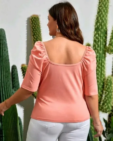 Camiseta con fruncido en las mangas de farol, color coral, talla 1XL, nueva sin detalle, estiramiento muy poco. Se vende porque quedo grande del pecho. Viene reducida.