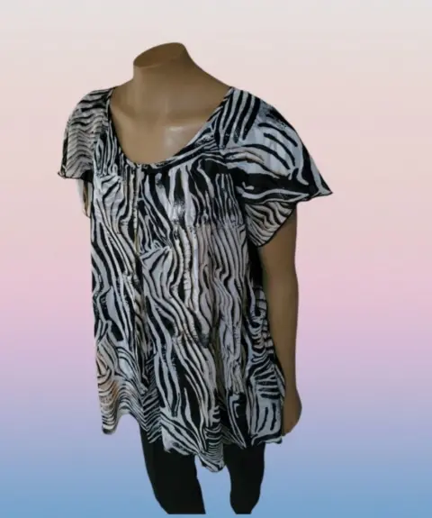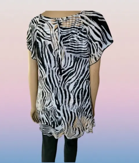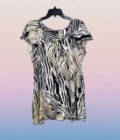 Cocomo Woman Blusa Formal. Cocomo Woman Blusa Formal, talla XL, color blanco con grafico de zebra multicolor, cuello redondo, manga corta de olan, doble layer con abertura al frente, estilo amplio deslizante, hecho mescla de algodón y poliéster, mide 52cm de hombro a hombro, 40cm de axila a axila, 46cm de cintura con 81cm de largo del hombro hacia abajo, puesto una ves en buen estado cosmetico.