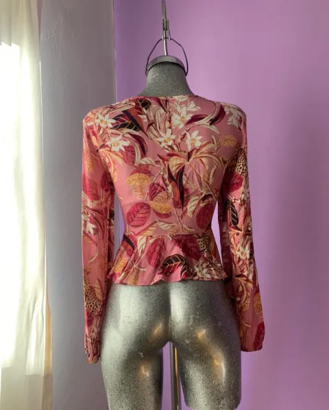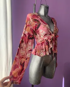 Crop rosa STUDIO F. Divina blusita de manga larga con resorte en los puños, con escote pronunciado en V. Se amarra a la cintura para un efecto peplum. Sus medidas son: 40cm largo, 41cm de axila a axila y 62cm manga. Es de la marca STUDIO F