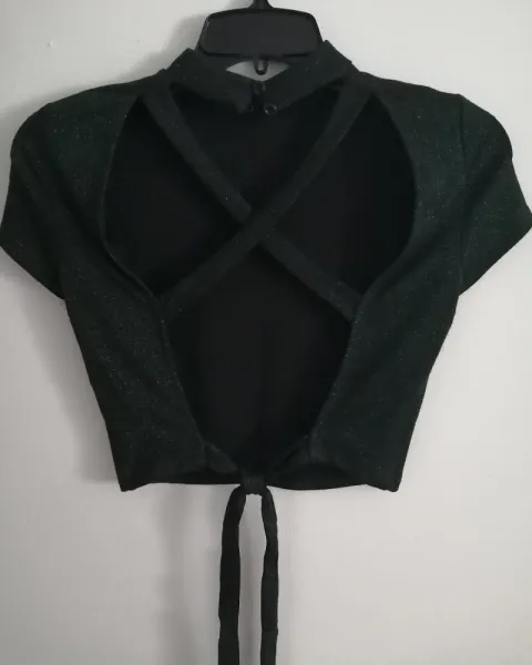 Crop top con escote en espalda. Crop top super padre y diferente, el escote de la espalda le da ese extra que lo hace super cool, además de que la tela es verde con unos toques de brillo!