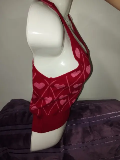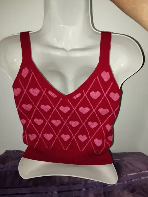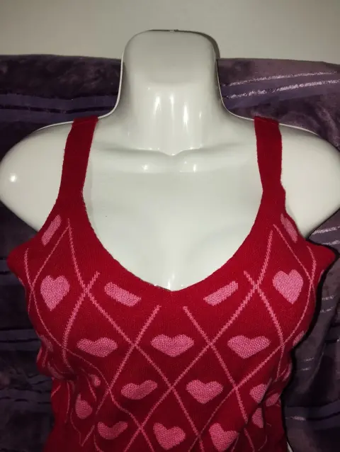 Hermosa blusa de tirantes tipo crop top, de punto, con detalles super lindos de corazón, escote V y tejido tipo resorte en la parte inferior, marcado como talla G. Medidas en la última foto ❤️Ideal para un outfit súper kawaii 🩷