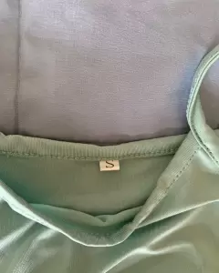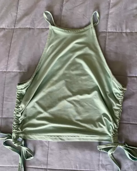Crop top de licra color verde menta o pastel, dice talla S pero queda a M viene algo amplio. Tiene tiras en los costados para ajustar el largo y no transparenta