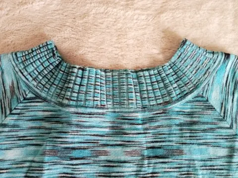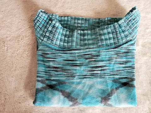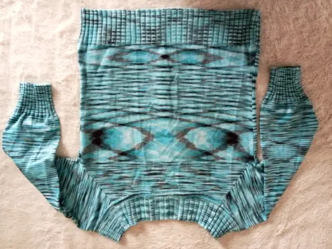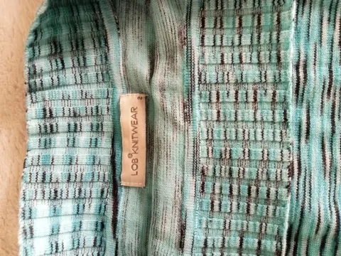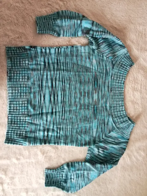 Crop top en color turquesa con vetas negras. Dos vistas diferentes, manga 3/4.Algodón y acrilan.Talla 2 (xs). Marca Lob.