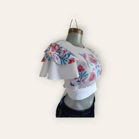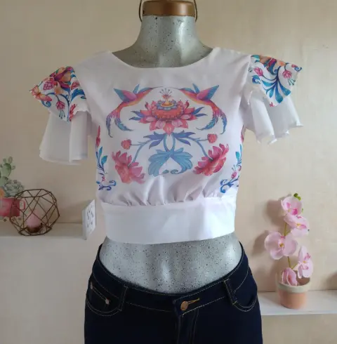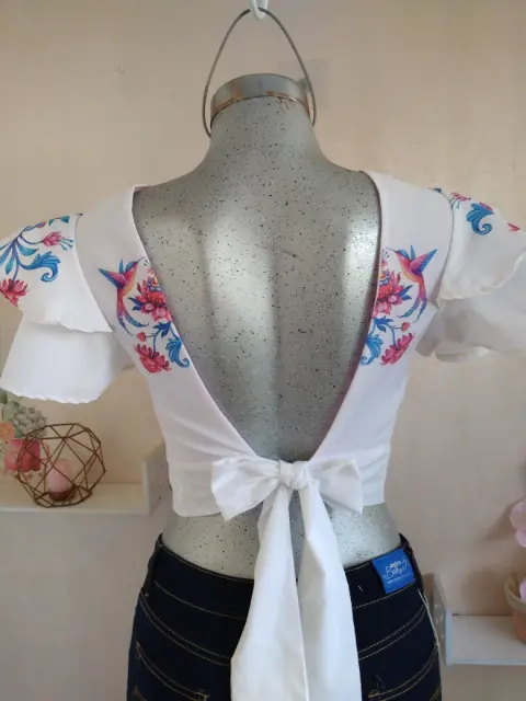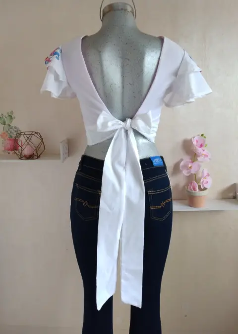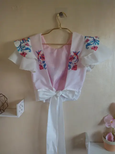 Croptop de espalda descubierta con cintas en la parte de atras para atar nudoEn popelina blanca con forro contrastante en color rosa pastelManga de olanesTela: PopelinaMedidas:Hombro a hombro: 35cmAxila a axila: 42cmCostado a costado en cintura: 40cmTodo se ajusta por el moño que lleva atras.Largo: 40cms
