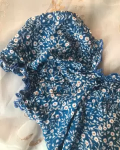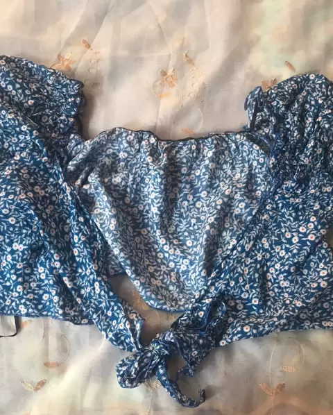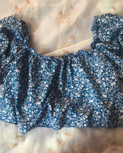 Croptop color azul con florecitas blancas, manguita aglobada, de la parte de atrás se amarra lo cual queda escote en la espalda, marcado como M pero queda bien desde S, 26cm largo, 52cm axila axila, 15cm ancho manga (tiene eleastico)