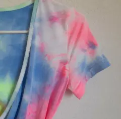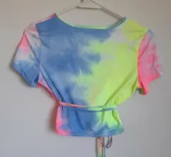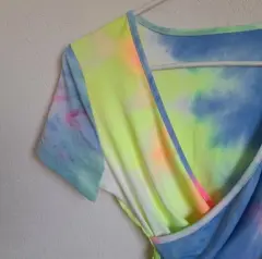 Croptop tye die diseño cruzado. Croptop cruzado estilo tye die verde azul rosa con tiras que se amarran a la cintura, no tiene talla pero queda a S . Esta super bonita, es nueva sin etiqueta. No tiene marca.