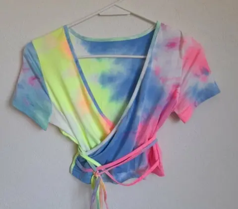 Croptop cruzado estilo tye die verde azul rosa con tiras que se amarran a la cintura, no tiene talla pero queda a S . Esta super bonita, es nueva sin etiqueta. No tiene marca.