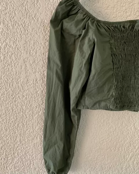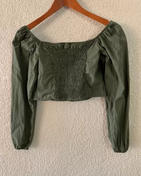 Croptop verde olivo con manga ancha. Hermoso Croptop cuidado con el perro, color verde olivo, se puede abotonar. Tiene elástico en la espada. La manga es muy cómoda, llévatelo ya con regalo sorpresa 🎉