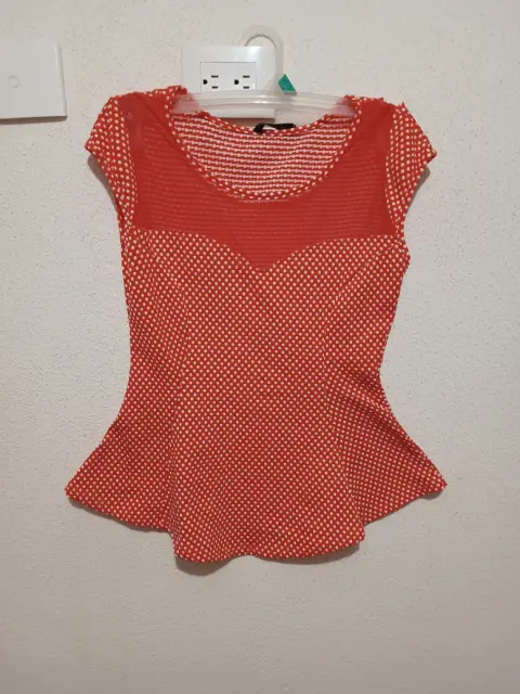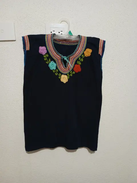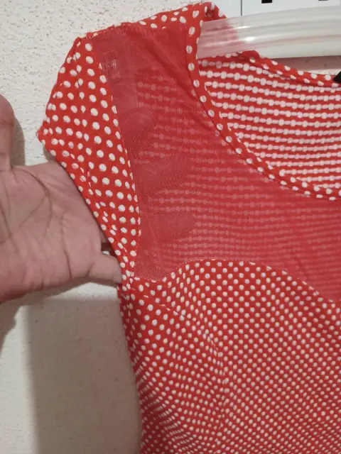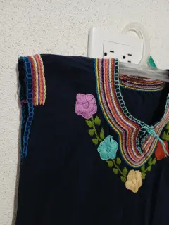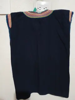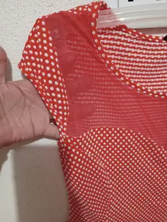 Blusa salmón con puntos blancos y transparencia en el pecho, súper strech, y blusa azul bordada a mano artesanal