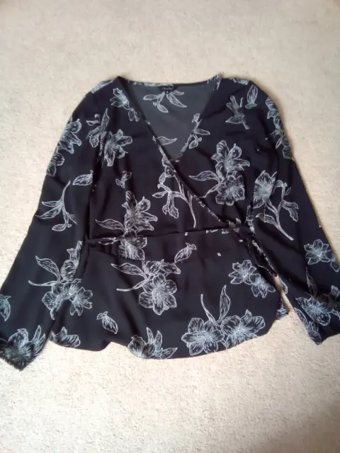 Elegante blusa. Blusa elegante manga larga de fondo negro y estampados blancos se ajusta con cinta alrededor de la cintura