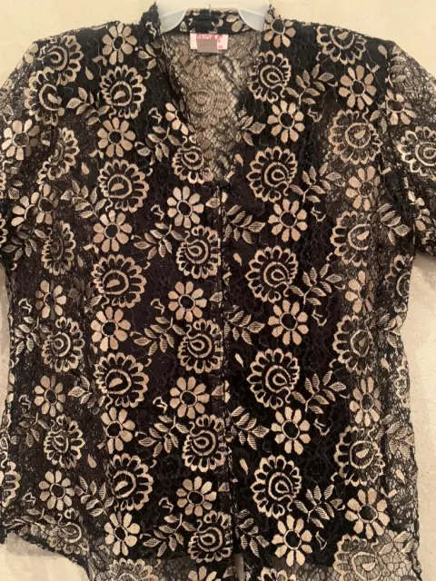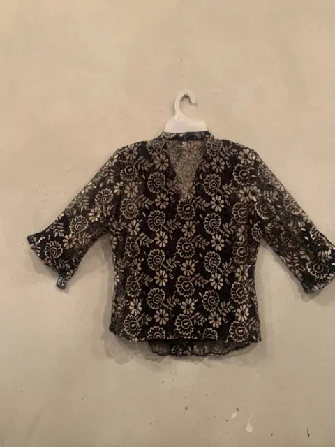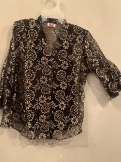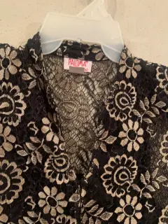 Elegante blusa de encaje. Elegante blusa de encaje con abertura al frente con 7 botones, manga 3/4 con abertura y un botón forrado con la misma tela Cuello en V, con camiseta 100 % poliéster para evitar transparencia.