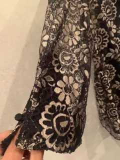 Elegante blusa de encaje con abertura al frente con 7 botones, manga 3/4 con abertura y un botón forrado con la misma tela Cuello en V, con camiseta 100 % poliéster para evitar transparencia.