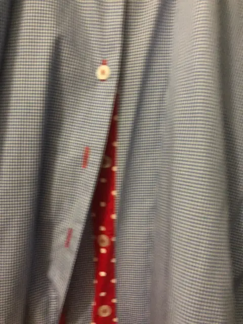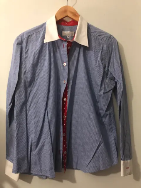 Elegante blusa de vestir de mascota azul.. Blusa de vestir en mascota azul, con puños y cuello blanco, los ojales son rojos para realzar el color y que se vea divertida y elegante!