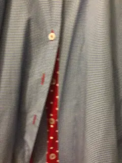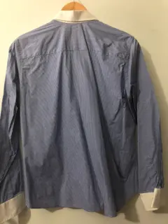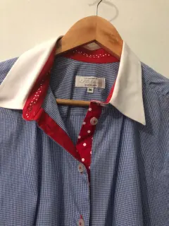Blusa de vestir en mascota azul, con puños y cuello blanco, los ojales son rojos para realzar el color y que se vea divertida y elegante!