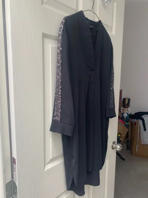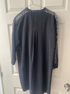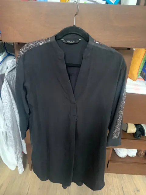 Elegante blusón negro de la marca Zara. Talla chica. Viene amplio y fresco. Tela suave al tacto. Excelentes condiciones. Bello y elegante tira de lentejuela. Ideal para usar solo o con pantalón.