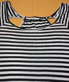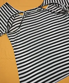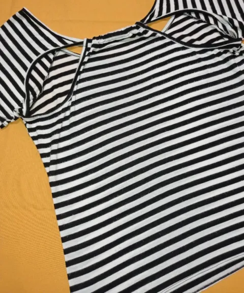 Escote Espalda Rayas. Blusa a rayas en tela fresca con strech,, es usada, no rota, no manchada, algunas bolitas en la tela por las lavadas, pero aun con vida de uso. Busto: 50 cmCintura: 48 cmCadera: 54 cmLargo: 65 cmLa blusa se midió sin estirarla, aun da de 5 a 10 cm el strech. Lleva de regalito unos aretes dormilona de plata Ley 925.