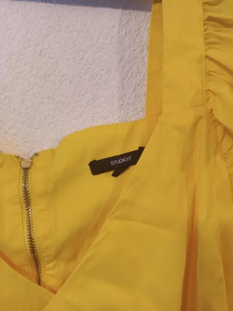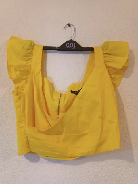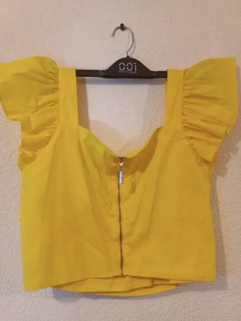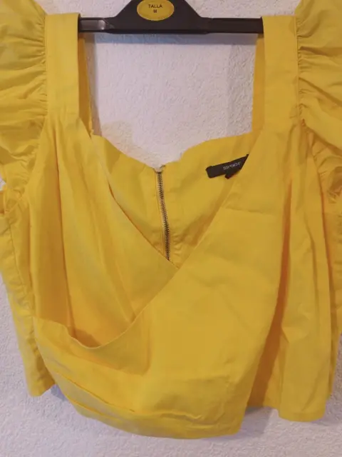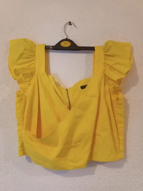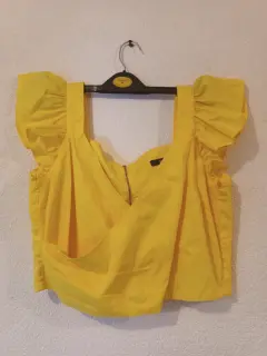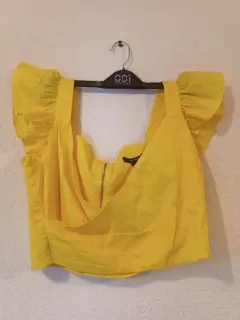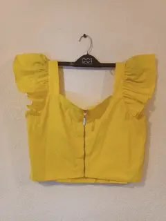 Blusa corta y de manga corta con olan color amarillo, escote cruzado, con cierre trasero en perfectas condiciones.