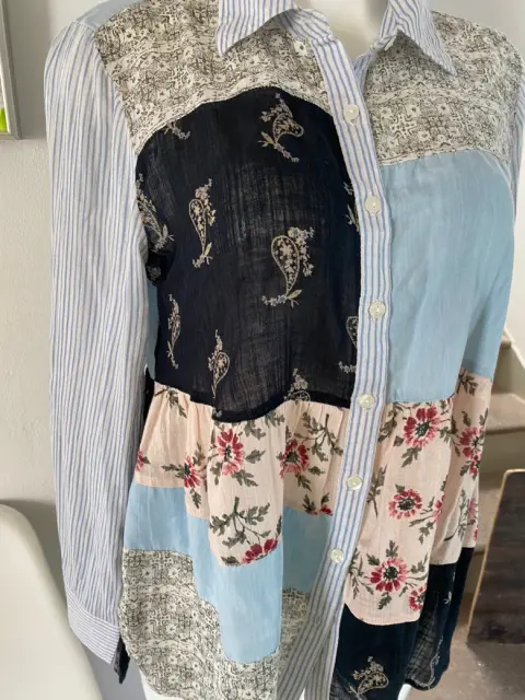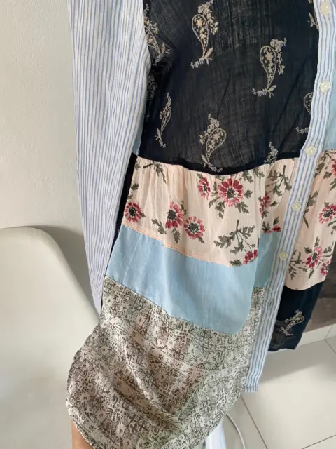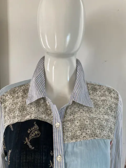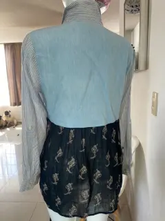 HERMOSA CAMISA MEZCLA DE COLORES Y TEXTURAS. HERMOSA Y DIFERENTE BLUSA CON MEXCLA DE TEXTURAS Y COLORES, predomina el color azul tiene botones en la parte de enfrente, mide 55 cms de axila a axila, 60% algodón súper fresca, sin detalles, perfecta!!