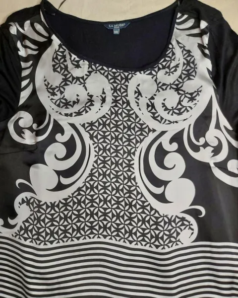 Hermoso blusón o blusa aguadita con un estampado muy lindo de frente y liso negro de atrás. Manga 3/4 talla 38.