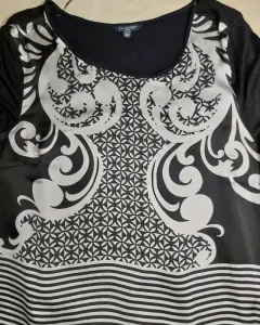 Hermoso blusón con figuras. Hermoso blusón o blusa aguadita con un estampado muy lindo de frente y liso negro de atrás. Manga 3/4 talla 38.
