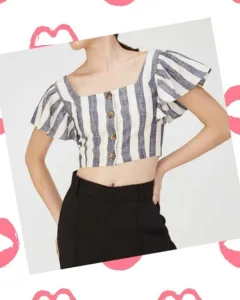 Crop top gris con negro con botones al frente y manga con buelito ajuste en espalda con elástico queda como la última imagen