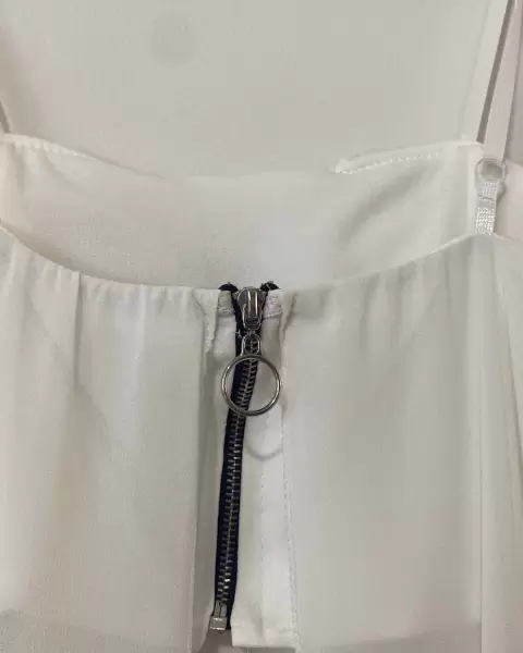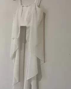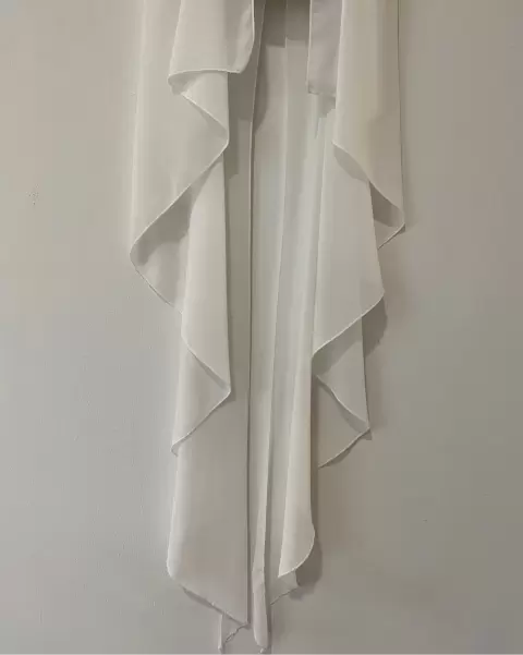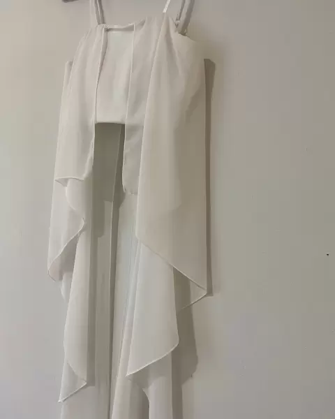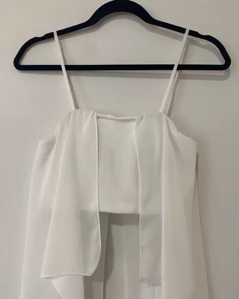 Espectacular Top Chifon Italiano color blanco en sedosa tela, 2 caídas largas increíbles! Mide 40 cm de axila a axila sin estirar y mide 20 cm alto de top y 116 cm de caídas tipo cola Luce bellísimo puesto cuenta con cierre en parte de atrás, bellos tirantes ajustables copas en área de top, una bbeleza