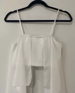 Increíble top Italiano blanco. Espectacular Top Chifon Italiano color blanco en sedosa tela, 2 caídas largas increíbles! Mide 40 cm de axila a axila sin estirar y mide 20 cm alto de top y 116 cm de caídas tipo cola Luce bellísimo puesto cuenta con cierre en parte de atrás, bellos tirantes ajustables copas en área de top, una bbeleza