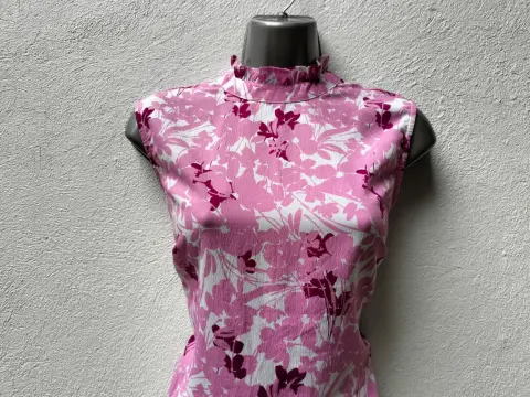 Linda blusa manga Corta súper elegante, con cuello algo y efecto plisado en el cuello botón trasero atrás del cuello, no estir