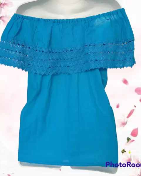 Linda blusa campesina. Blusa campesina de cuello de olan y resorte. Con hermoso detalle de tira bordada.Tela de algodón que no estira pero viene amplia.