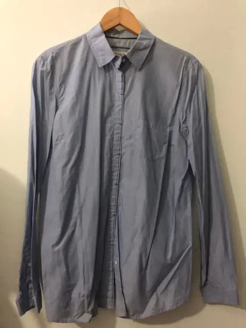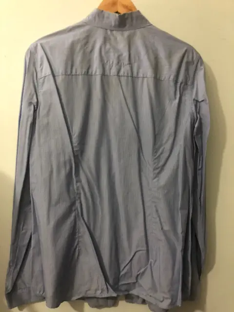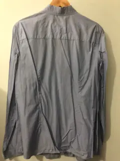 Linda blusa de vestir azul cielo. Blusa rayada color azul cielo, con botones invisibles al frente y bolsita. Tiene 3 botones en los puños y costura lateral para estilizar la figura. Los botones son pequeños y discretos.