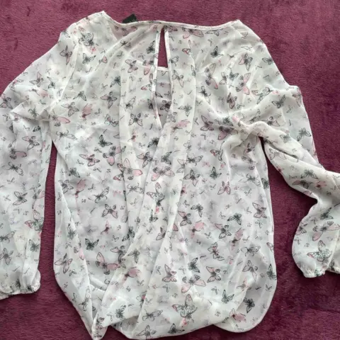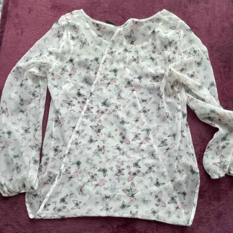 Blusa de transparencia.Con lindísimo estampado de mariposas en colores pasteles.Luce increíble con un bralette blanco o rosa.Manga larga con resorte. Pinzas en el busto.La parte de atrás queda suelta y descubre la espalda.La tela es súper cómoda y fresca.Talla 7, o chica.Marca Metrópolis Company.Detalle imperceptible por hilo (ver última foto).