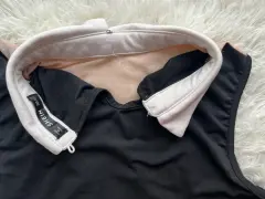 Súper lindo con cuello y con tela transparente en el pecho , de abajo tela de buena calidad súper bonito , nuevo sin detalles talla xs , queda a ch también estira un poco.