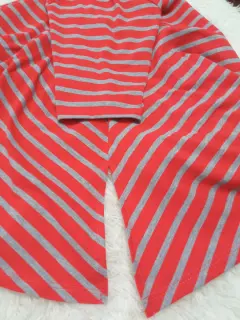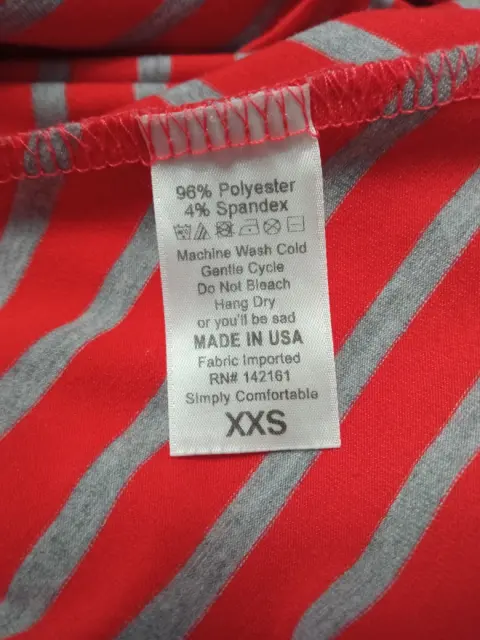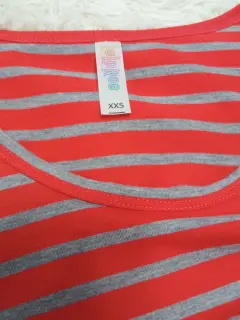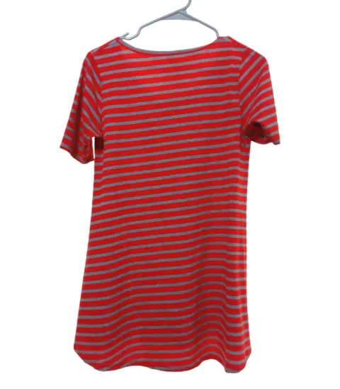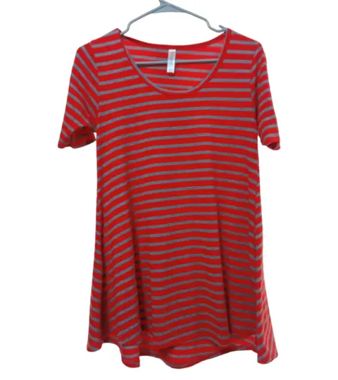 Lula Roe Blusón en forma Swing.. Lula Roe blusón para dama en forma de swing en T con coquetas aberturas laterales y favorecedoras medias mangas Simple, cómodo y versátil, rayado colores rojo y gris.Talla XXS.Nuevo sin etiquetas.Medidas: 75cm de largo trasero y 70 cm frontal. 70cm espalda-pecho, 96 cm ancho en cintura y 180 cm en la parte de abajo en la abertura ( corte T).Materiales: 96% poliéster y 4% spandex .