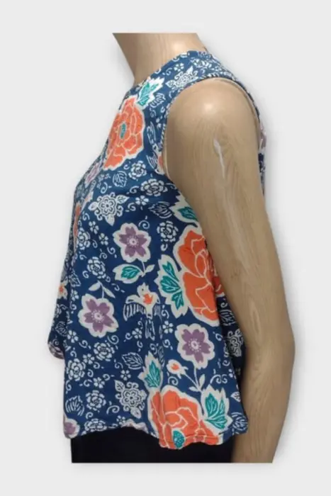 OLD NAVY Blusa Dama Rayón Azul XSMarca: OLD NAVYOrigen: VietnamMaterial: 100% RayónTalla: XSEstilo: CasualPatrón: BlusaColor: Azul Marino y estampado flores Cierre: BotónPecho: 43 cmLargo: 50 cmHombro: 31 cmManga: Sin MangasRopa de USO en muy buen estado