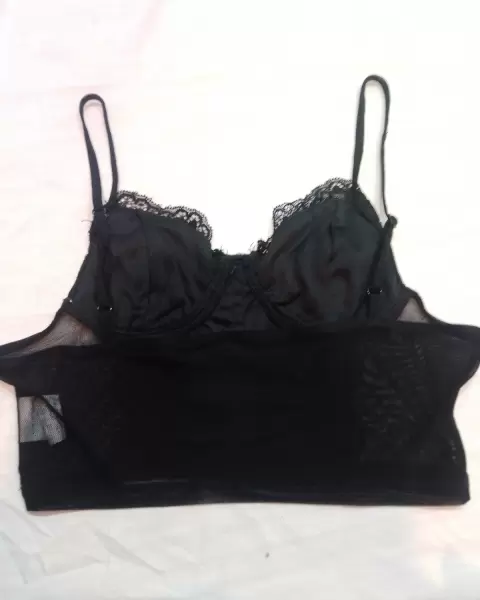 Ombliguera negra de encaje. Blusa tipo ombliguera de tela transparente con detalles en encaje, la talla del busto es muy pequeña con detalles tipo corset.Medidas:Longitud en el busto: 23 cmEspalda: 37 cmCintura: 30 cmLargo: 22 cm además de tirantes ajustables.