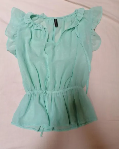Dos blusas de Seda talla chica, la verde obscuro nueva la verde oliva puesta una vez. La blusita color menta es de poliester y va de regalo. Todas talla chica y en excelente estado