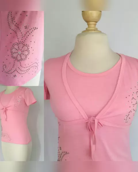 PAQUETE Blusa c/Aplique y Arracadas. PAQUETE Blusa tono ROSA BEBÉ c/aplique bisutería, top simulado c/tiras mismo tejido p/mejor ajuste, cuello redondo y manga corta. Unitalla (reducida, da mejor a M) Arracadas tono PLOMO c/bisutería translulúcida y cierre p/clip. Dimensiones cms: Blusa 33.5 hombro, 46 axila, 38.5 cintura, 46.5 zona baja, 54.5 largo, 14.5 largo manga Aretes 7 circunferencia. 50% algodòn, 50% poliéster / Aleación zinc