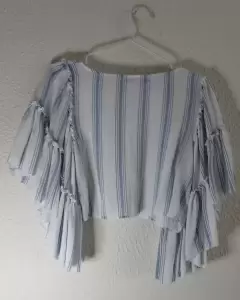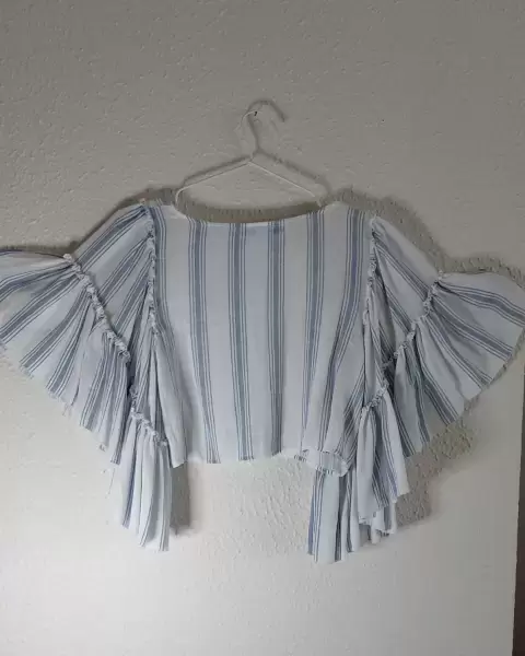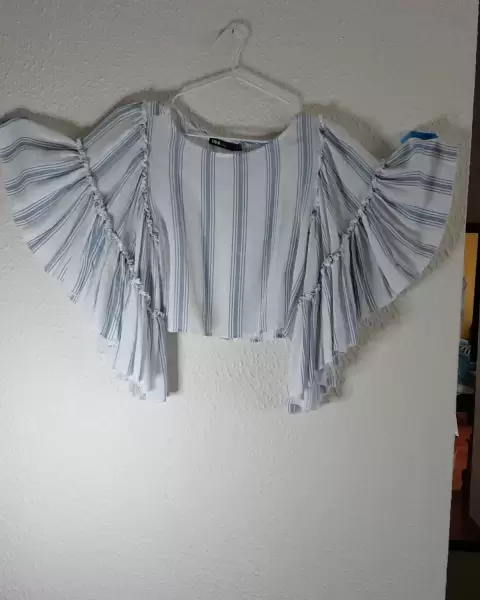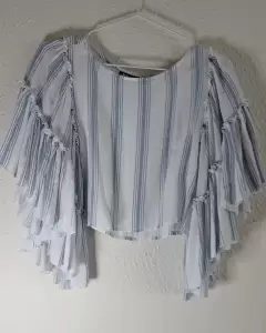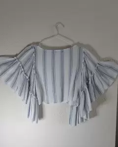 Playera azul con rayas blancas manga vampiro. Blusa corta blanca con rayas azules con manga de olanes tipo vampiroIdeal con pantalones de mezclilla
