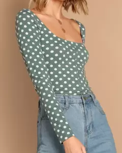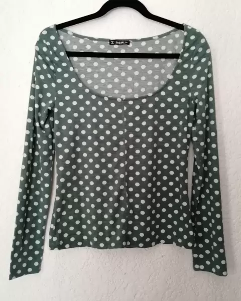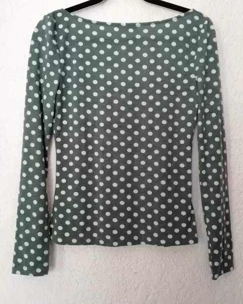 Playera de lunares cuello redondo de manga larga. Producto nuevo. Camiseta verde de cuello cuadrado con estampado de lunares blancos.Medidas: ancho hombros 39 cm, ancho busto 43 cm, largo 57 cm, largo manga 64 cm.Material: 6% espandex, 94 % poliéster.