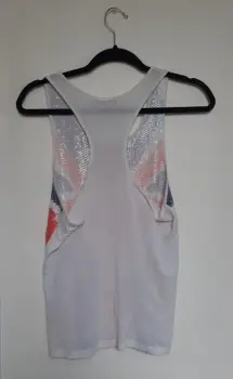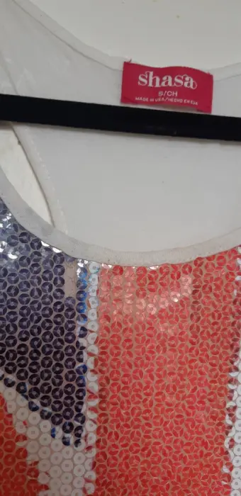 Preciosa playera de tirantes con la bandera británica hecha con lentejuelas. Esta un poco amplia y súper bonita,le hacen falta algunas lentejuelitas como se muestra en una de las imágenes.