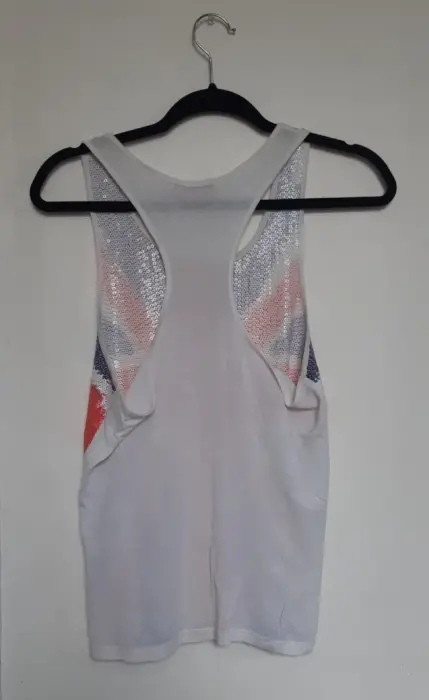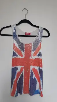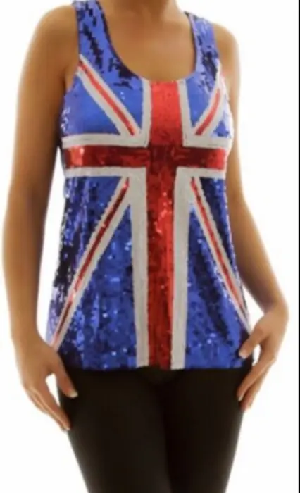 Playera tirantes bandera británica. Preciosa playera de tirantes con la bandera británica hecha con lentejuelas. Esta un poco amplia y súper bonita,le hacen falta algunas lentejuelitas como se muestra en una de las imágenes.