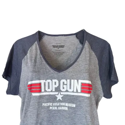 Playera top gun maverick. Playera Top Gun con estampado, en una cómoda tela de 50% poliéster, 25% algodón, 25% rayón, manga ranglán corta y cuello En v en contraste. Prepárate para disfrutar de esta nueva aventura con el rebelde aviador Pete Mitchell.