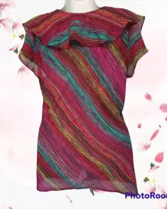 Preciosa blusa con escote en V y olanes al frente; las mangas con volados.La tela no estira pero hace una hermosa figura.Para llevar en look formal o casual será de tus prendas favoritas ❤️