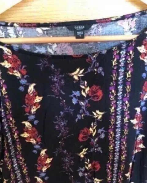Preciosa Blusa Negra Floral GUESS. Preciosa Blusa Negra Floral GUESS en color negro con diseño floral. Hermosa y delicado arruche en mangas. Tela suave en strechs. Talla S tambien queda a M.