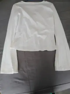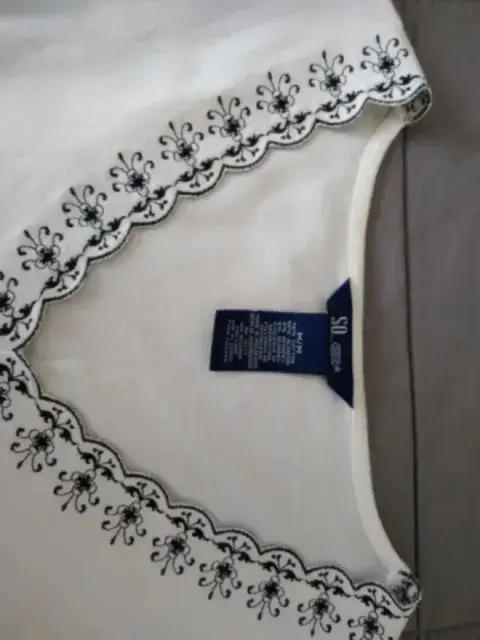 Blusa blanca de algodón, stretch, cuello en "V" con decoracion de bordado en negro, talla mediana, manga larga y un poco acampanada, fresca, una puesta.