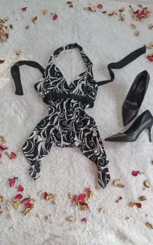 Preciosa blusa, con escote V al cuello, es más larga de los costados como se aprecia en la imagen, y hace una figura previosa, se hace un moño en la espalda