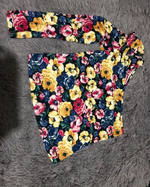 Shein top con estampado floral. Hermoso top de manga gigot, con un solo hombro,talla grande,medidas hombro:36 cm,Pecho:92cm,largo :56 cm,largo de manga:78.5cm