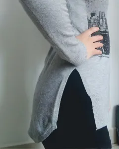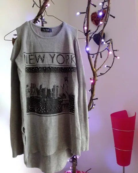 Suéter Blusa New York. Suéter blusa gris, estampado con aplicaciones de piedras de fantasía, hombros descubiertos, diseño cola de pato.