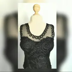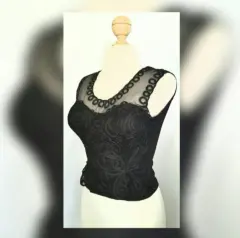 Tank top color negro sin mangas, escote ilusión, con encaje negro en toda la zona frontal y copas preformadas para busto. 95% elastano, 5% poliéster. Para lavado en seco. Unitalla (reducida, da mejor a talla S/M). Dimensiones: 35 cms hombro a hombro, 40 cms axila a axila, 31 cms cintura, 36 cms zona baja, 37 cms largo. SIN DETALLES, se uso solo una vez. SE ENTREGA CON LIMPIEZA DE TINTORERIA.