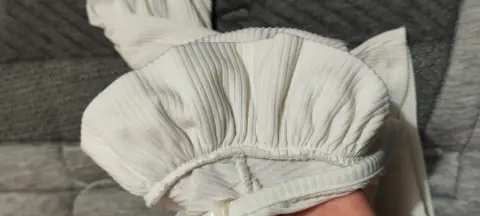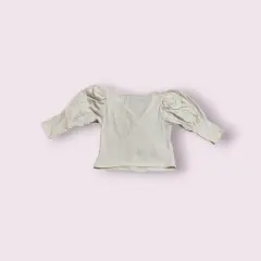 Top Blanco cruzado de hombros bombachos. Se usó un par de veces, muestra un poco de desgaste en el color. La tela se transparenta un poco, así es el estilo. Talla S, no queda ajustado al cuerpo.La mangas son 3/4 llegan a la altura del codo, no cubren totalmente el brazo.
